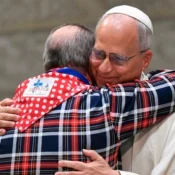Pope Leo XIV hugs a man during the Jubilee of Roma, Sinti, and Travelers on