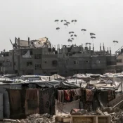 A plane drops food aid over Rafah, in southern Gaza, in August 2025. / Credit: